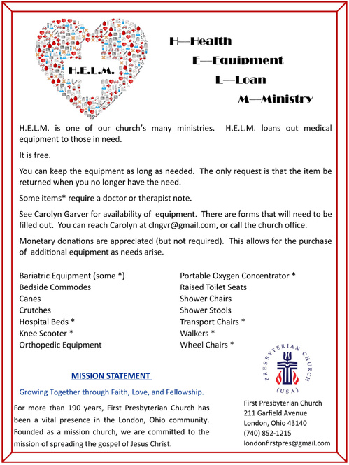 First Presbyterian Church, has a new ministry we want to share with you. Carolyn Garver has created this ministry to loan health equipment to those who need it. This is a much needed ministry in our community, and we salute her! Don’t hesitate to share this information if you know someone it can help.