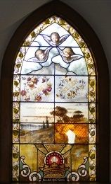 On the right hand side of the front entrance hall is a window given by the ladies of the church and congregation in memory of the departed wife and daughters of the pastor, Rev. W. L. Slutz, who has been so sorely bereaved within the past few months. The window, although not as large as some of the others, is certainly one of the prettiest in the church. The name of Mabel, enclosed in a wreath of pink Marischal Neil roses appears on the left, and on the right is the name of little Helen wreathed in pansies, her choice flowers. At the bottom is the name of Mrs. Julia M. C. Slutz above which is a beautiful crown, fully jeweled.