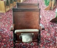 With its auditorium-style sanctuary, very typical of Akron Plan architecture, First United Methodist Church has been equipped with theatre-type seats since the building was constructed in 1894. Our church never had pews typical of those one might expect to find in a church sanctuary. Churches of Akron Plan architecture were equipped with either arc-shaped pews or theatre-type seats. The two remaining original theatre-type seats were on display during service on Sunday, December 22. Our original theatre-type seating was supplied by Grand Rapids School Furniture, which still exists today. The company has been in business since 1886. But after twenty years in business, the name was changed to American Seating to more accurately reflect its full line of business. They still manufacture seating for classrooms, auditoriums, lecture halls, cafeterias, libraries, break rooms, conference rooms, and administrative offices in the K-12 and college and university market. They also manufacture seats for busses and other transportation vehicles. In the world of entertainment, American Seating products can be found in several famous venues, including Madison Square Garden, Dodger Stadium, and Fenway Park.