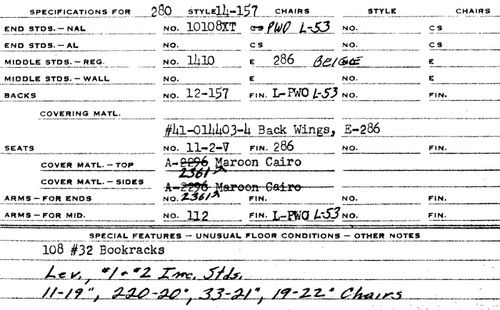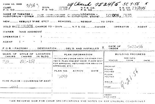 I knew the current seats were made by American Seating, so I began my search by giving them a call. I talked to Becky DeVault, a very kind and courteous lady, indeed. She was a 40-year veteran of the company. I gave her our information and after hearing much rummaging around of cards and papers, she reported her findings. “The order was placed in 1956 and consisted of 280 total seats, 11 at 19 inches, 220 at 20 inches, 33 at 21 inches, and 19 at 22 inches.” She told me they would love to work with us and that new foam and covers could easily be made. I couldn’t believe it! After all of these years, they still had our records. So, American Seating prepared an estimate. From our conversation, Becky knew of my passion for all historic things related to our church, so she scanned and emailed me the original 1956 order and all information about our seats.