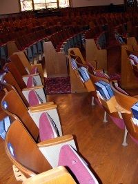 I gave a report to the board of trustees. We decided it would be best to see a sample of the new replacement product. When I called to it, I learned that Becky had retired. Julie, her replacement, was not very cooperative. She told me they could not produce cushions and covers for us, that our chairs were too old, and that our project was too small for their company. I was totally shocked and hugely disappointed. But oddly enough, Julie asked me to send them a sample seat to at least see what they might be able to do for us. She told me not to expect anything to come of it. Wow! How would you like a person like that representing your company? A few months passed with no word from American Seating.