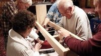 Tom Straley’s ingenious press he built to compress the seats while the coverings were wrapped over the “teeth” on the steel frame. Joe & Sharon Brackett and Grace & Glenn Feyh operate the machine.