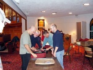 Typically, American Seating arranges for installation with local contractors. But in the interest of keeping the expense down, and given the astonishing willingness of our congregation to help with such projects, I knew we could do it ourselves. The first stroke of brilliance came from trustee Tom Straley. With sample in hand, he engineered and built a press that we could use to compress the seats during the recovering process. Tom graciously donated his time, smarts, and effort to the cause. Tom’s contraption was, without question, the most important aspect of the seat recovering process. And the people at American Seating were impressed with it! They even said Tom’s press was under consideration for inclusion in their museum in Grand Rapids!